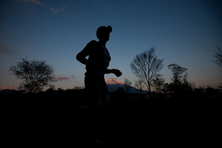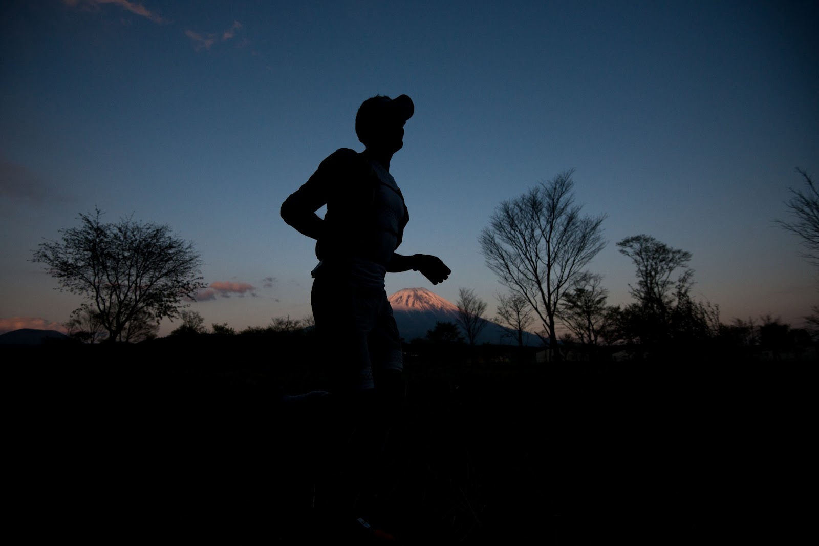 The sun started to rise and presented a scene of beauty that left me nearly pinching myself. Fuji in all her glory, a full moon lingering off her shoulder, a red blanket colouring the horizon, and a Lake Yamanakako appearing from within the shadows down below as though a curtain had been drawn back on its slumber. A brief moment after digesting all of this and there were photographers and videographers dotting the landscape in front of me. They'd positioned themselves for just this moment in the race and I threw my arms in the arm and screamed,
