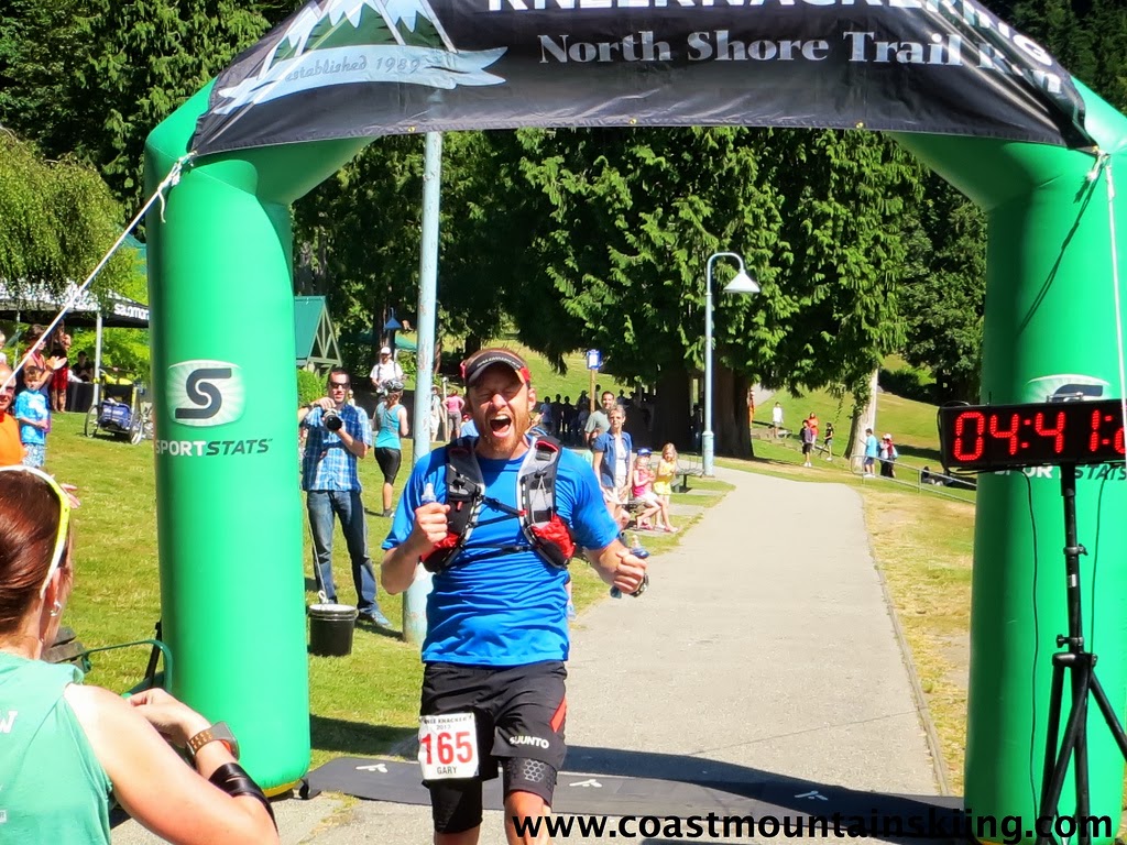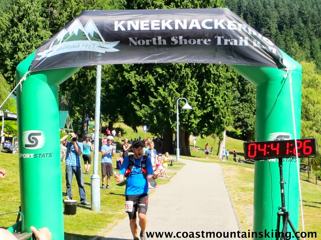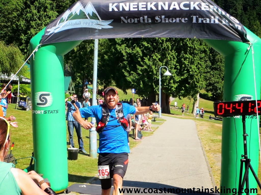 The Knee Knacker starts off with a near 4,000ft vertical ascent of Black Mountain up and into the Cypress Mountain ski resort. This is just one of the things that make this race such a classic, and so hard to nail your best time on the course. Come over the top just a few minutes faster than you physically should and you'll suffer the consequences all day long, come over the top a few minutes slower than you should and you'll be playing catch up all day long. It's a fine line and after our group of four let local mountain goat Shaun Stephens-Whale get off the front I settled in with Canadian Skimo racer and recent training buddy Nick Elson and road speedster Graeme Wilson (31min/10k). The guys were letting me lead and as I continually fell back into a power hike over the steeper terrain I was expecting them to pass. I sometimes underestimate my power hiking abilities and when we came through the first aid station in 1h19m45s it was not only a few minutes faster than I thought I could crest the climb, it was a few minutes faster than I'd hoped to crest the climb. I had intentions of challenging Aaron's CR but I knew I'd need to improve upon his second half time as his first half time seemed at the upper limits of my climbing abilities. IF I were able to push his CR I knew it would be by mere seconds and not minutes. The fact that Aaron set this time on a snow year and with no one within twenty minutes of him at the finish is another story. He attributes it as one of his best ever ultras and it's not hard to understand why.